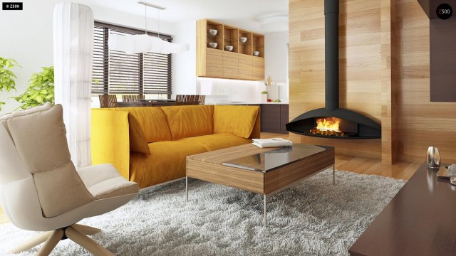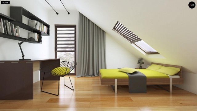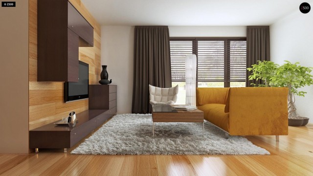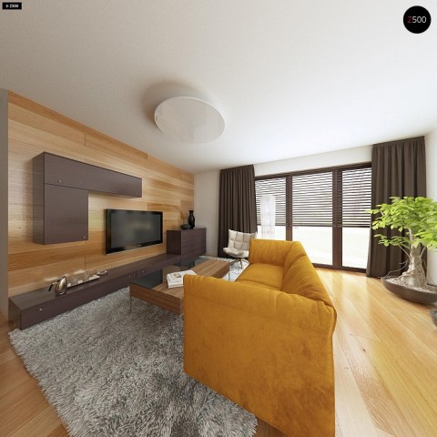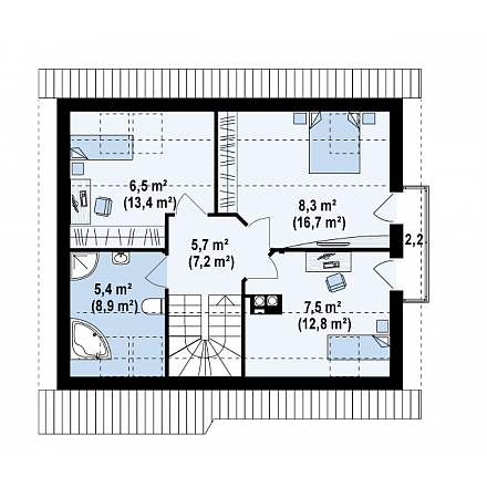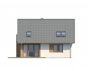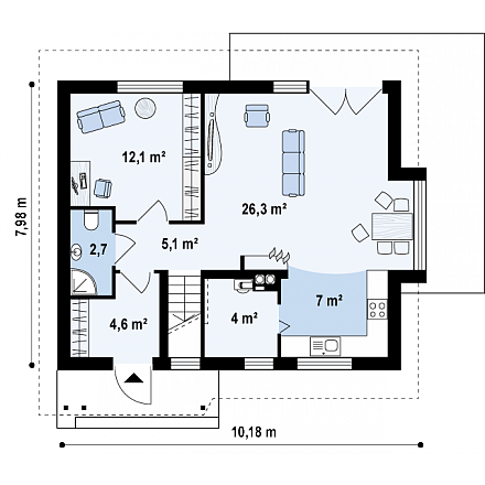 Небольшой дом с дополнительной комнатой на первом этаже, большим хозяйственным помещением и эркером в столовой.