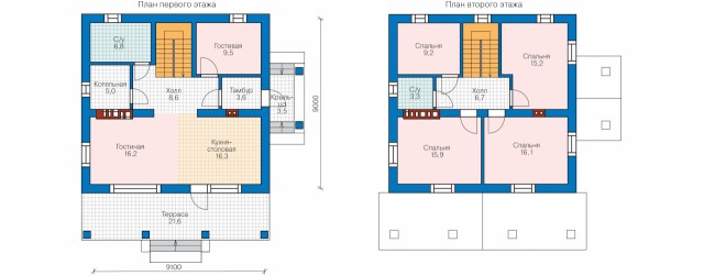 Пространства первого этажа располагаются вокруг центрального холла. Отсюда же лестница ведет нас на второй этаж. Второй этаж традиционно используется в качестве зоны отдыха. Здесь мы видим четыре спальные комнаты и общий санузел. Все пространства сгруппированы вокруг центрального холла. В таком доме сможет постоянно проживать семья из пяти человек.