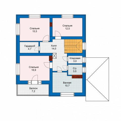 Котельная, согласно нормам пожарной безопасности, имеет свой обособленный вход. На втором этаже разместились три спальни, большая освещенная ванная, санузел, кладовая и гардероб. Одна из спален имеет балкон.