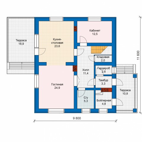 Есть так же еще один вход, однако он скорее будет использоваться преимущественно в теплое время года, так как ведет нас в гостиную с террасы и не оснащен тамбуром. Сразу из холла мы можем попасть в большую гостиную и кухню-столовую, объединенную общим пространством. Так же на этаже имеются кабинет, гардероб, санузел, кладовая и котельная.