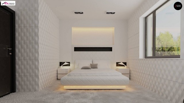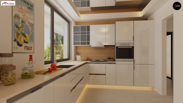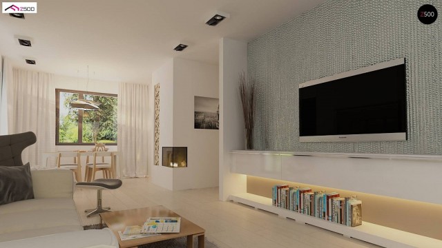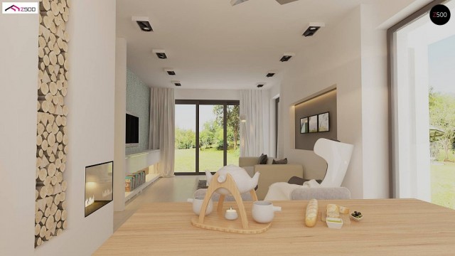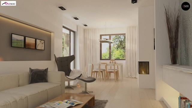 Проект Z259 представляет небольшой по размеру и продуманный по содержанию одноэтажный дом с большой площадью остекления в гостиной. Лаконичная форма и строгие линии позволяют удачно расположить этот объект даже на небольшом участке. Для стен выбран светлый тон экрю, который прекрасно сочетается с коричневой черепицей двускатной крыши и деревянными элементами фасада орехового оттенка.