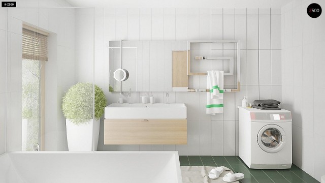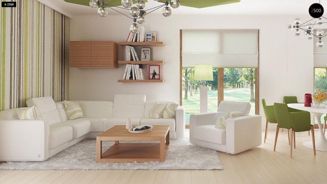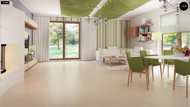 В проект заложена открытая планировка кухни, которую, при необходимости можно обособить, установив стенную перегородку. Тогда все процессы приготовления еды будут скрыты от зоны отдыха, что добавит комфорта всему дому.