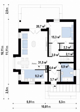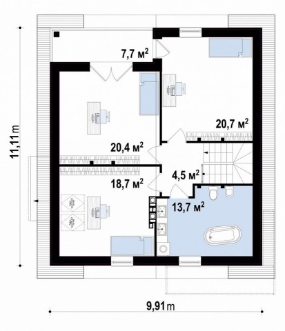 Дополнительная комната на первом этаже позволит рациональнее и комфортнее организовать ежедневную домашнюю деятельность. Для дополнительного удобства она оборудована собственной гардеробной и выходом на террасы, хотя при желании от них можно отказаться.