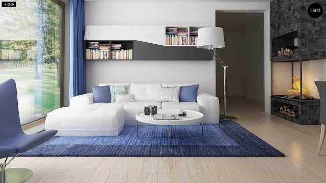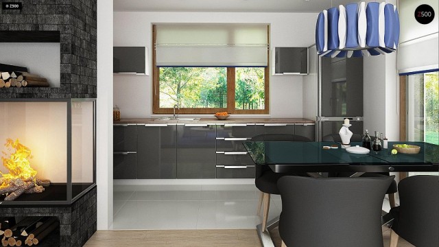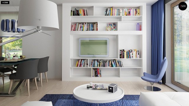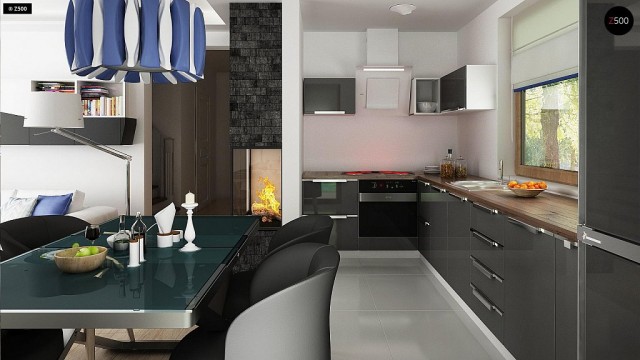 Простая форма дневной зоны и открытая кухня визуально увеличивают пространство дневной зоны и способствуют ее лучшему освещению. Но при необходимости кухню можно отделить от остального пространства стенной перегородкой.