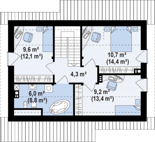 Спальни на мансарде спроектированы максимальной площади на относительно небольшой площади этажа.