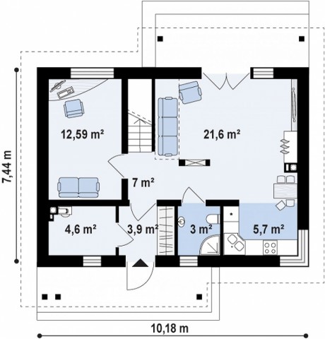 Двускатная крыша, простая форма и конструкция дома, его относительно небольшая площадь способствуют сокращению затрат на строительство и эксплуатацию.