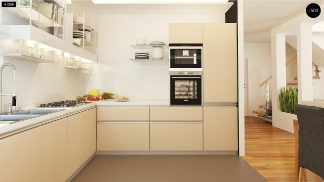 Открытая кухня визуально увеличивает пространство гостиной, способствует ее лучшей освещенности благодаря угловому окну на кухне. При необходимости кухню можно отделить стенной перегородкой.