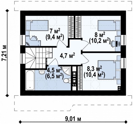 Санузлы расположены один под другим, упрощают организацию водопровода и канализации в доме.