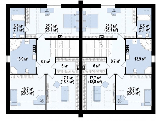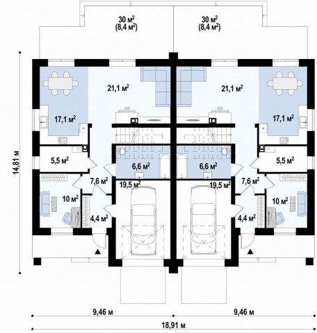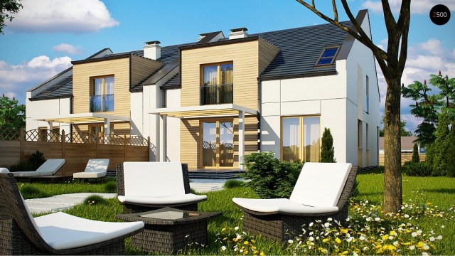 Разработка Zb13 представляет проект домов для симметричной застройки стильного современного дизайна. Светлые тона, выбранные для оформления фасада, поддерживают лаконичную форму дома (гараж практически незаметен).