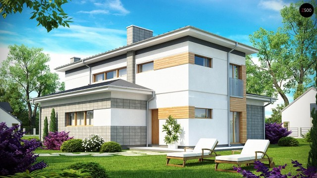 Проект Zx25 представляет удобный двухэтажный дом в стиле модерн с боковым гаражом. Фасад, отделанный светлым деревом, привлекает внимание изящно оформленной террасой и угловым остеклением первого и второго этажа. Благодаря гармоничной форме и светлой цветовой гамме дом великолепно выглядит на открытых участках.