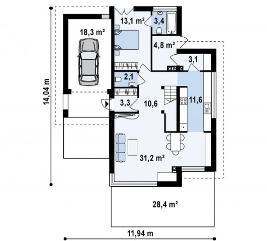 На первом этаже сформирована дневная зона. Вперёд вынесены гостиная и столовая (они визуально объединены с террасой, на которую предусмотрен выход). Кухня расположена чуть дальше. Все помещения плюс просторный холл образуют прекрасно спланированное пространство для отдыха. Также на первом уровне находятся спальня с ванной, общий санузел и хозяйственное помещение, из которого есть выход в сад.