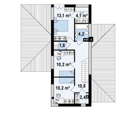 Три спальни, спроектированные на втором этаже, образуют ночную зону. Все комнаты и общая ванная выходят в просторный холл, который освещается через панорамное остекление лестничного марша.