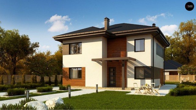 Сложная конструкция кровли и современный дизайн, сочетающий серую, белую штукатурки и обшивку из дерева, делают строение уникальным, оригинальным и стильным.