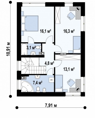 Верхний этаж — это зона, отъеденная для сна и отдыха. Здесь находится три просторных светлых комнаты, одна из которых оснащена ванной комнатой. Также здесь есть и общая ванная комната.