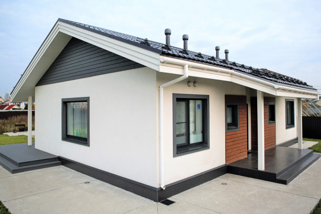 Компактный с двускатной крышей соединяет в себе функциональность, экономичность и практичность. А отделка фасадов из натурального дерева делает простое и скромное строение элегантным и неповторимым.