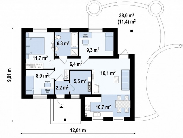 расположение гостиной со стороны входа позволяет удобно расположить дом на участке с южным въездом;
