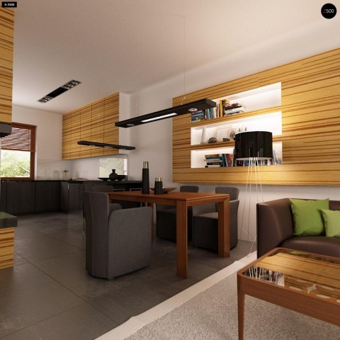 Открытая кухня визуально увеличивает площадь дневной зоны, но при желании ее можно отделить от остального пространства стенной перегородкой.