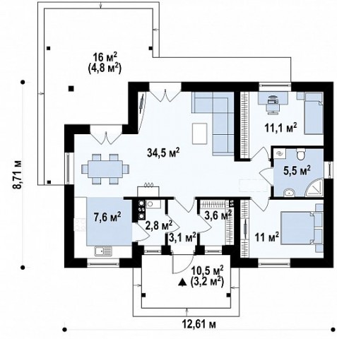 Крытая терраса создает небольшую уютную зону отдыха и поможет, также организовать вкусный шашлык в любую погоду.