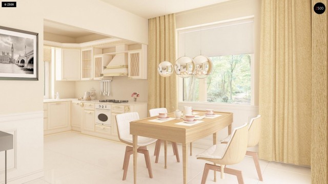 Расположение выхода на террасу в столовой позволит быстро и удобно организовать прием пищи на свежем воздухе в теплое время года, или наполнить столовую летним ароматным воздухом.