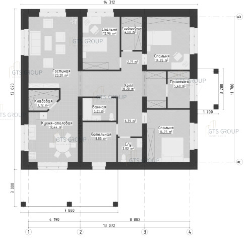 Проект дома Жасмин - шикарный вариант для постоянного проживания за городом, а также сезонного отдыха. Прекрасно подходит для участков большой площади. Внутренняя планировка достаточно проста и максимально функциональна.Просторная гостиная, визуально зонированная кухня, три замечательных спальни изолированных друг от друга, раздельные ванная и санузел, большая бойлерная и просторная гардеробная. Особого внимания заслуживает зона, где расположена большая терраса, которая станет лучшим местом для приема пищи в окружении красот и изумительного аромата природы.
