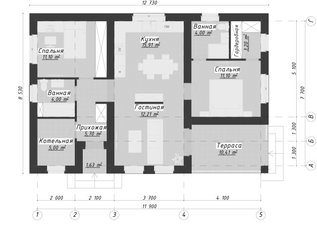 Кроме того, в доме предусмотрено помещение котельной, что обеспечивает удобство в обслуживании системы отопления и горячего водоснабжения. Это решение позволяет сохранить порядок и организованность в доме, не отвлекаясь на технические моменты.